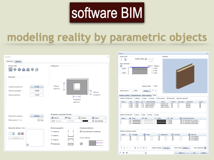 Nei software di progettazione BIM questi modelli descrittivi si risolvono con oggetti “intelligenti”, con forme e informazioni basate su parametri perfettamente adatti ad essere registrate e gestite in un database informatico.