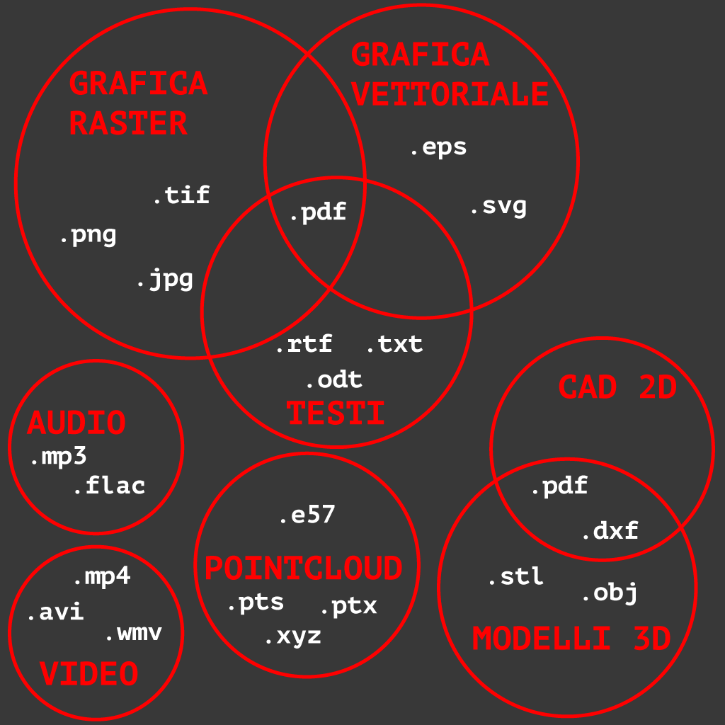 In base al tipo di documento ci sono formati di interscambio, adatti cioè ad essere scritti e letti da tutti i software della stessa tipologia di lavoro o anche più d’una. Questi formati però, per essere standard, devono limitare moltissimo tutte le caratteristiche che possono salvare.