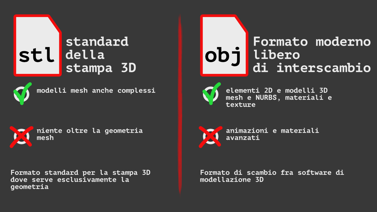I modelli scaricabili in internet per la stampa 3D sono tipicamente in .stl perché le informazioni rilevanti sono unicamente la loro forma geometrica. Se invece si vuole esportare/importare oggetti modellati per il rendering il formato .obj è uno dei più diffusi e versatili.