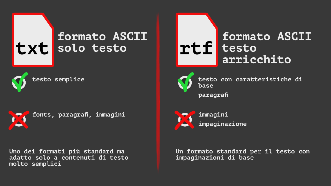 Il formato .txt è il più semplice modo di salvare il testo nella sua forma di soli contenuti (lettere). Usando il formato .rtf si riesce a conservare gran parte delle caratteristiche del testo e dell’impaginazione ma bisogna verificare che sia sufficiente allo scopo.