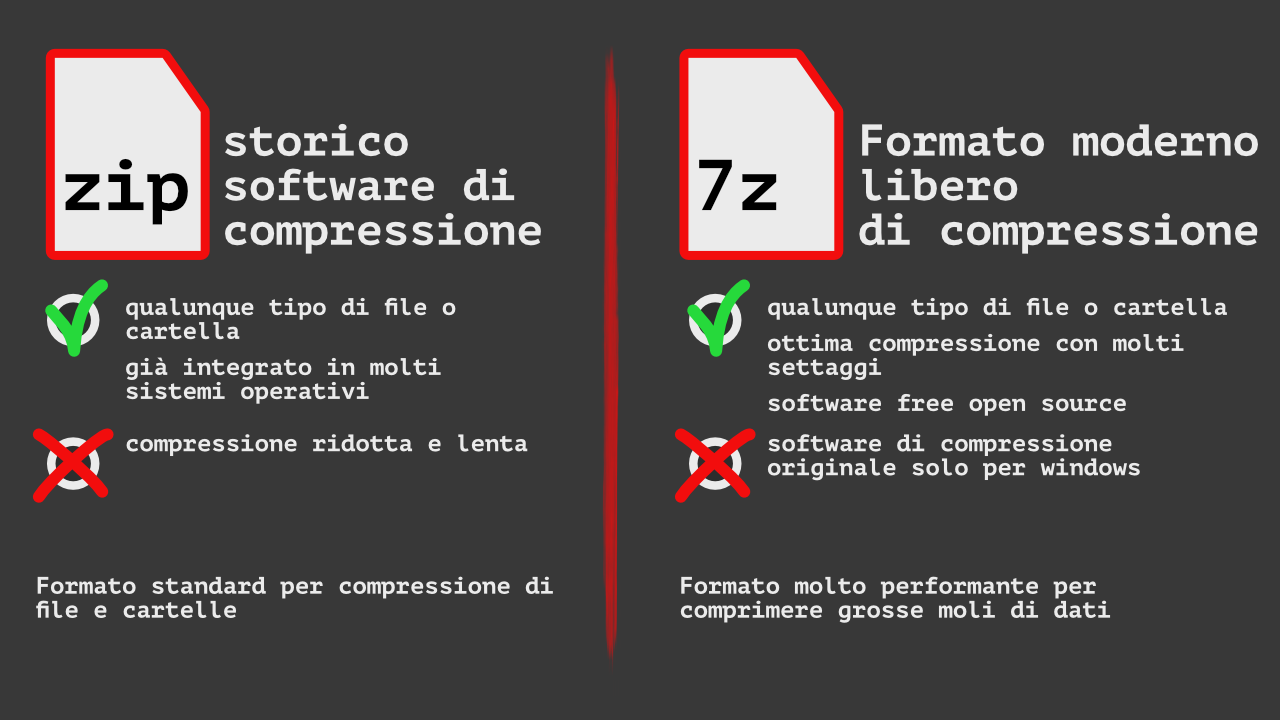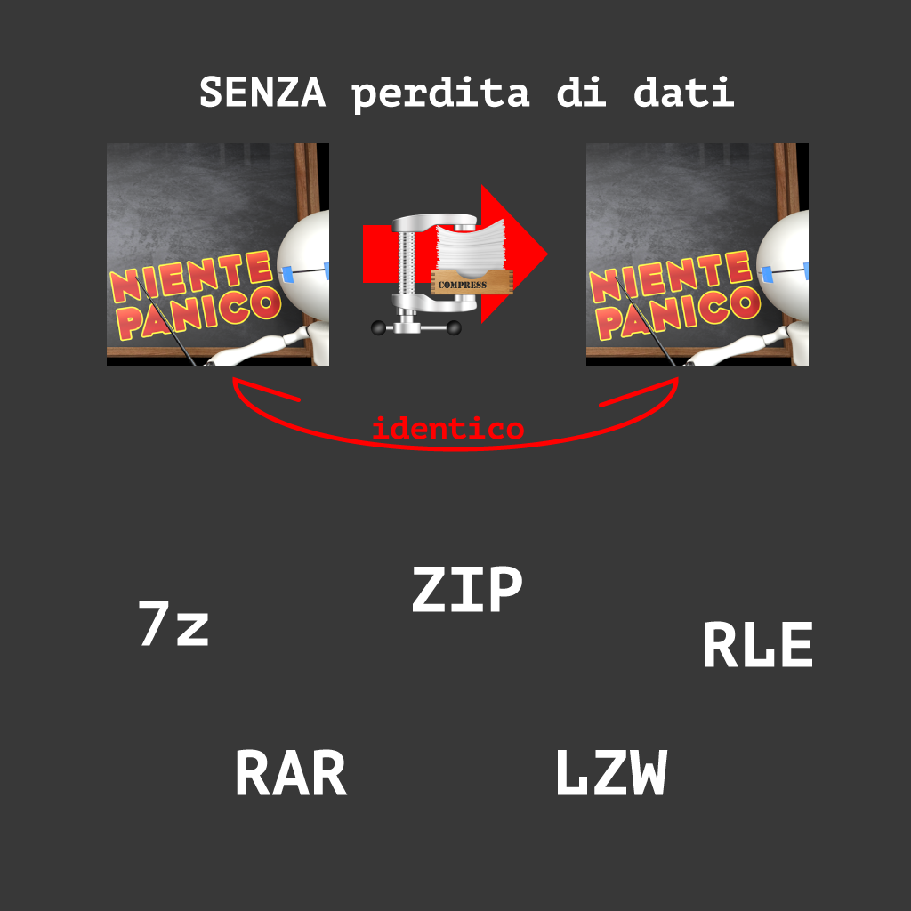 Comprimere SENZA perdita di dati significa scrivere le informazioni in un modo più efficiente. Ci sono vari metodi, in base alla tipologia di dati da trattare (testi, immagini, generici, etc…) ma sono tutti caratterizzati dal fatto che il risultato, una volta decompresso, è IDENTICO all’originale. Vantaggio: occupa meno spazio in memoria ma non perdo nessuna informazione. Svantaggio: non comprime molto.