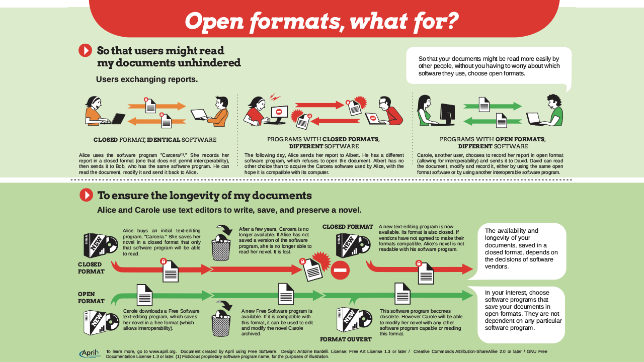 I formati proprietari sono tipicamente chiusi e solo i loro software possono leggerli e scrivere. I formati aperti sono utilizzabili da chiunque e qualunque software quindi assicurano grande longevità e versatilità di utilizzo.