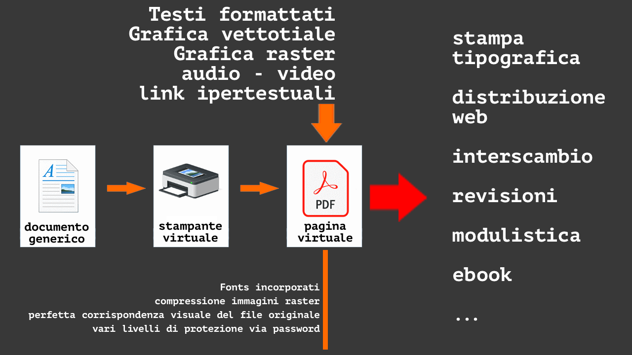 Il sistema PDF basato sul linguaggio PostScript è il più versatile sistema per produrre documenti stampati virtualmente e visualizzabili praticamente ovunque. Nonostante non sia nato come file di interscambio dati può prevedere la modifica dei contenuti.
