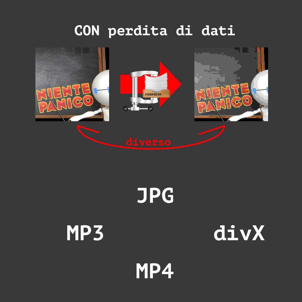 La compressione con perdita di dati punta ad eliminare le informazioni superflue o meno significative. Il file compresso NON É MAI uguale all’originale… si perde sempre qualche informazione ad ogni passaggio di compressione. Vantaggi: riduce moltissimo la dimensione in memoria del file. Svantaggi: si perdono irrimediabilmente informazioni ad ogni passaggio.