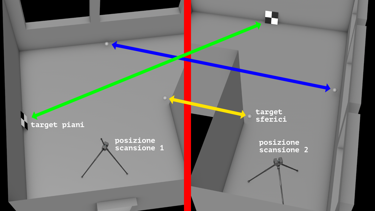 Posizionando dei target prima di eseguire le scansioni creo dei punti di riferimento ben definiti. Facendo coincidere almeno 3 target le due scansioni si combinano nello stesso spazio tridimensionale.