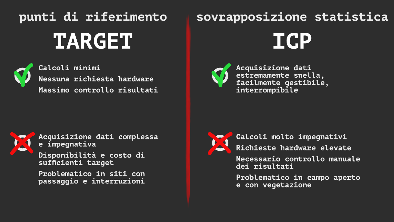 Entrambi i metodi hanno vantaggi e svantaggi. La migliore scelta è spesso, soprattutto in rilievi complessi, usarli entrambi in un approccio misto.
