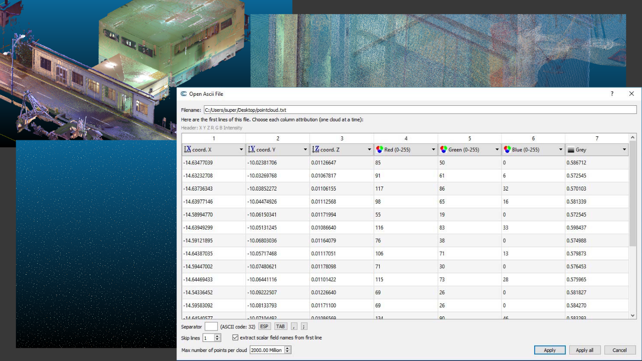 La pointcloud sembra, da lontano, un oggetto continuo. Avvicinandosi è facile verificare che in realtà sono tutti punti separati posizionati nello spazio. La point cloud in realtà è un lungo elenco di righe (una per ogni punto) in cui sono riportate: la posizione, intensità, colore, etc…